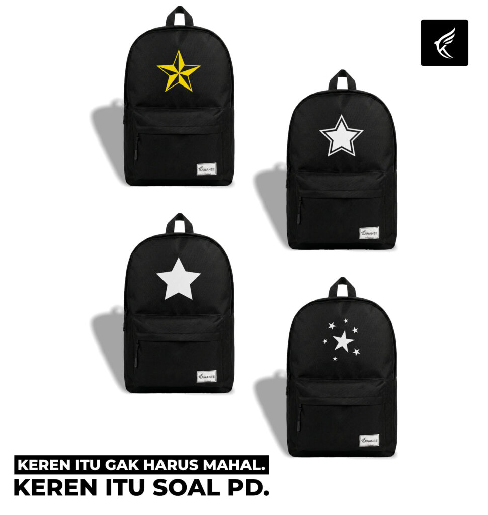 Tas ransel serbaguna dengan desain simple dan motif bintang emas, cocok dipakai untuk kuliah, kerja, atau aktivitas harian.